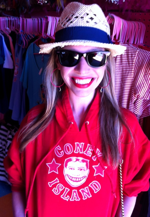 After swimming with the Polar bears the lovely Jordan warmed up in her cozy Lola Star sweatshirt! She is the home decor diva of the fabulous blog, Ramshackle Glam, and was in Coney Island to film a segment for her exciting new podcast! This episode features home decor inspired by Coney Island! Look for our amazing Lite Brite & our Michael Michael Motorcycle Coney Island poster on her new episode!